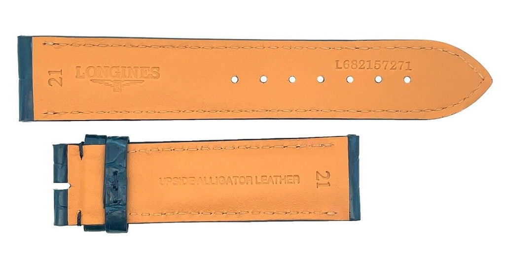 Description: Brand New, Genuine Leather Strap Lug Width Size 21mm Buckle Size 20mm  Longines Band Primary Colors Dark Navy Blue Material Genuine Alligator Length Regular Band Size Men's Short Band: 2.90 Inches Long Band: 4.5 Inches...