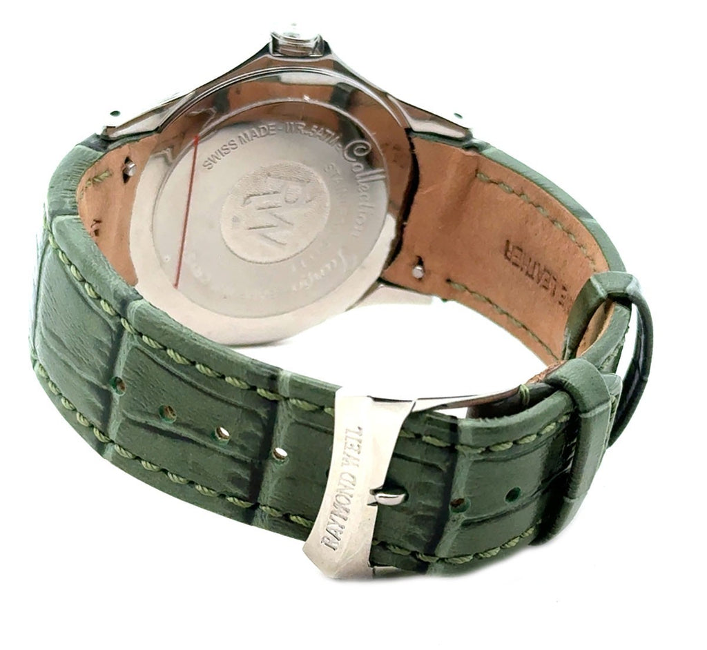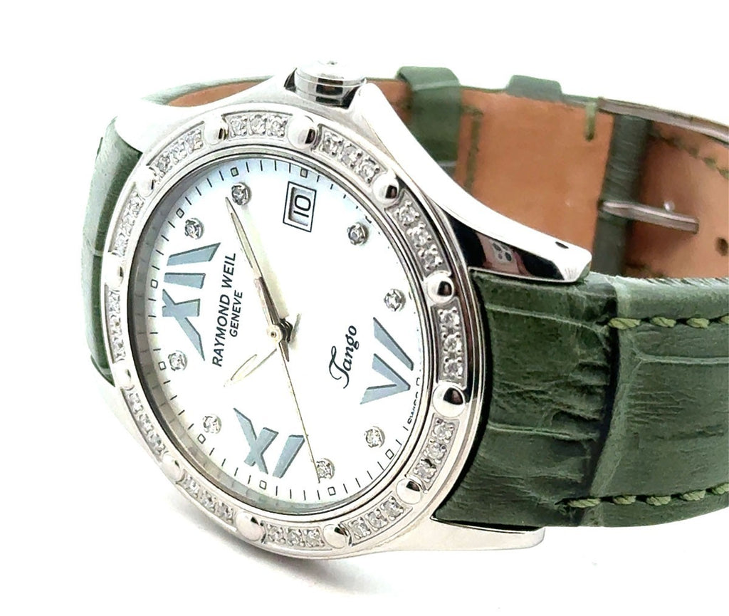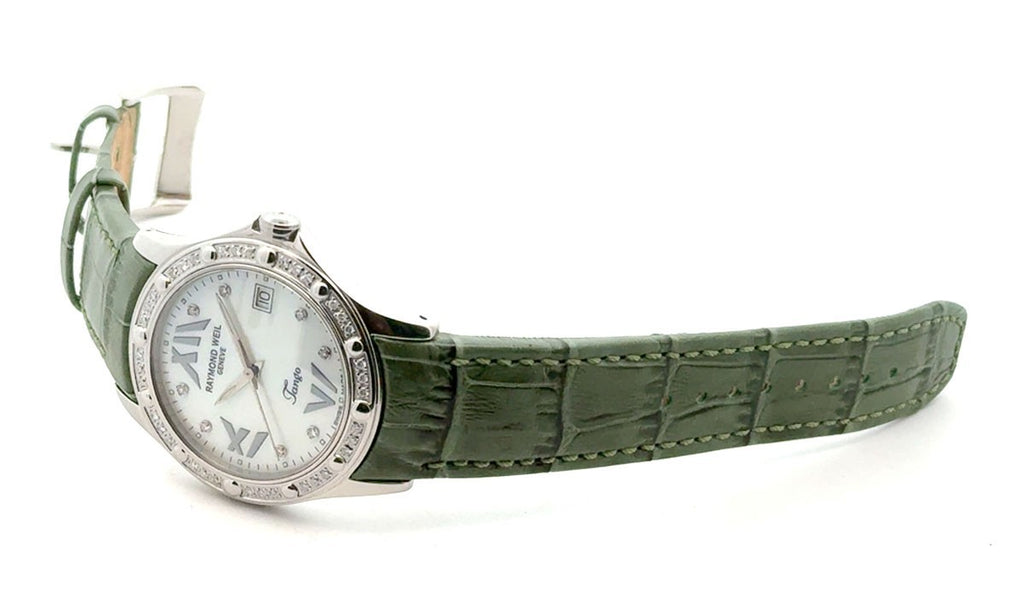 Raymond Weil Womens Tango Pearl Dial Green Leather Strap Watch 5590-S3S-97650