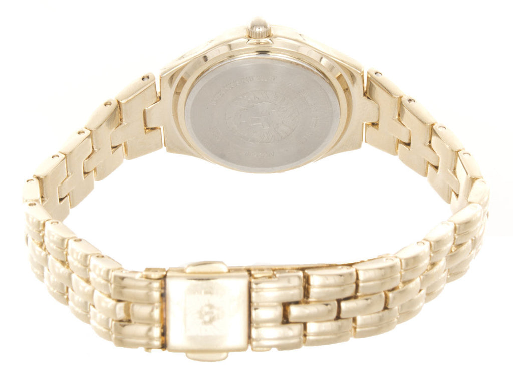 Watch Information: Gender: Ladies Case Size: 26mm Dial Color: White Material Case: Gold Tone Metal Material Band: Gold Tone Metal Diamonds: n/a Movement: Analog Quartz Water Resist: 30 Meters Water...