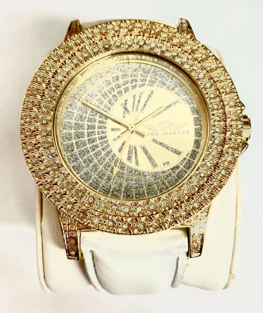 Brand: King Master Gender:   Men's Model:   142M Case material:   Gold-tone Stainless Steel with CZ Stone bezel Case diameter:   50.0 mm Dial Color:   Gold Bracelet:   Leather Clasp:   Buckle / Fold Over Deployment Movement:   Quartz Water resistant:   3 ATM Stones:   CZ Stones Crystal:   Scratch resistant mineral